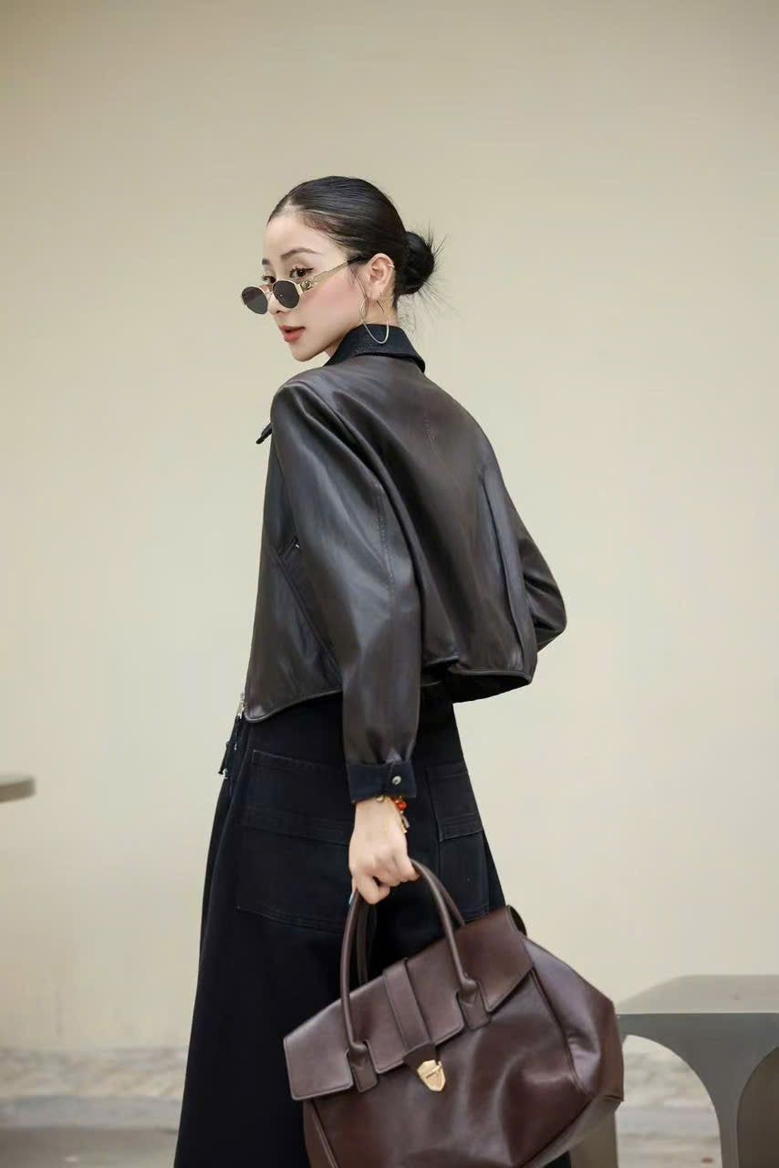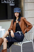 Elevate your look with our cropped faux leather jacket, a timeless piece designed for the modern wardrobe. Crafted from premium, supple leather, this jacket offers a comfortable yet structured fit that ends perfectly at the waist. It features a classic shirt collar and a smooth zip-front closure for a clean, sophisticated profile.