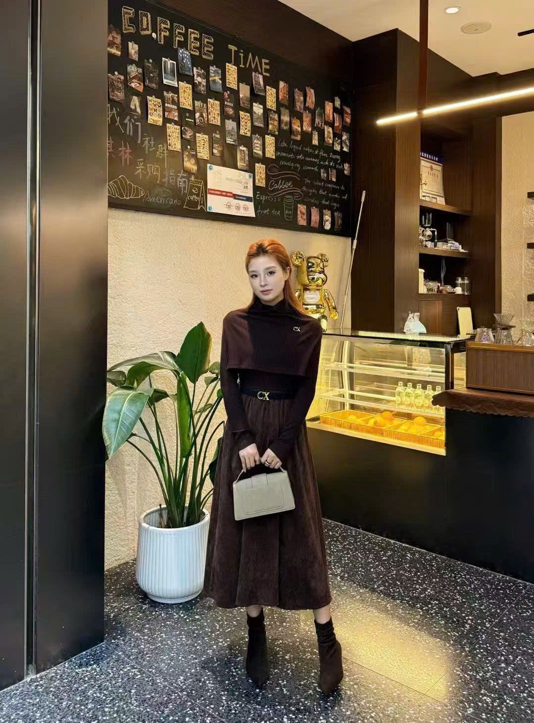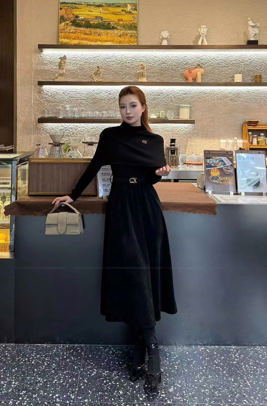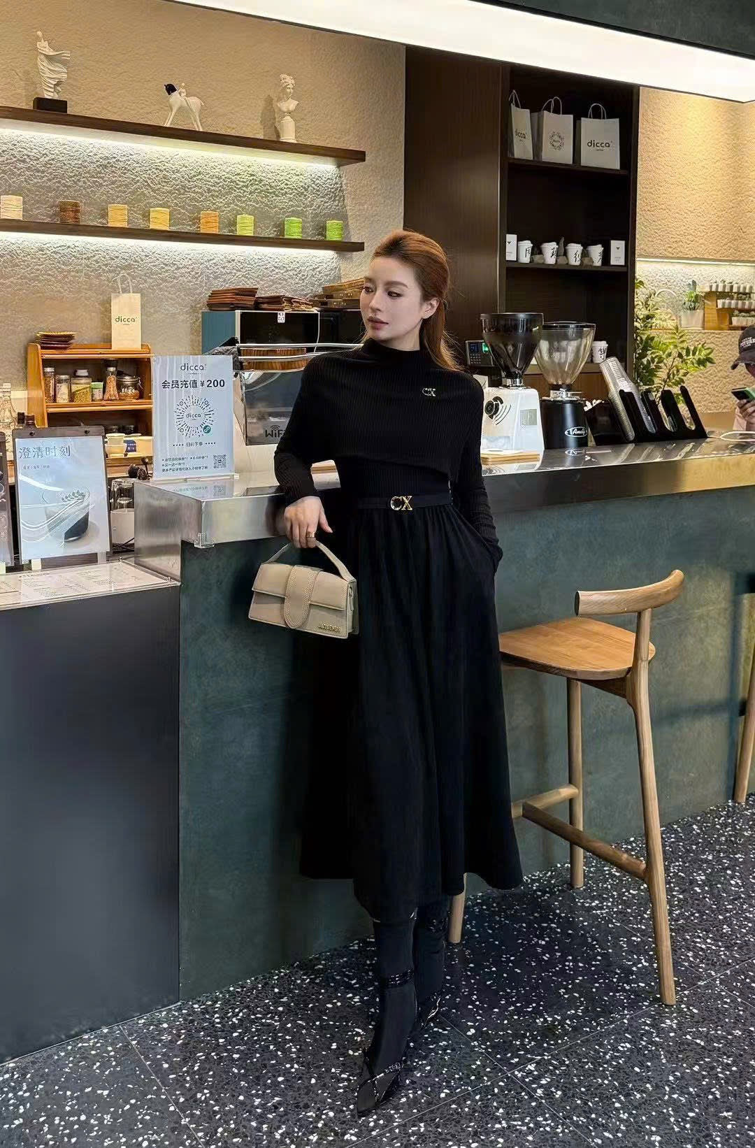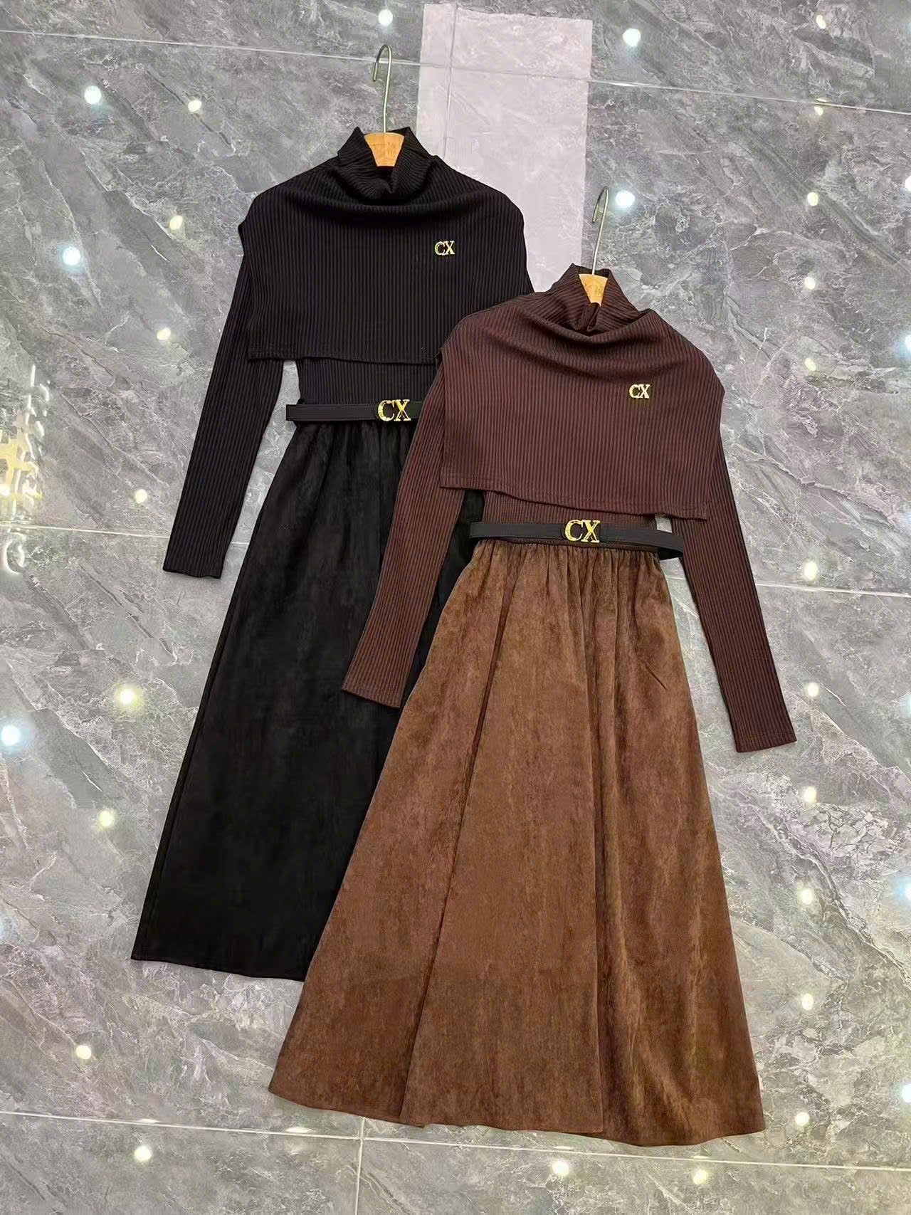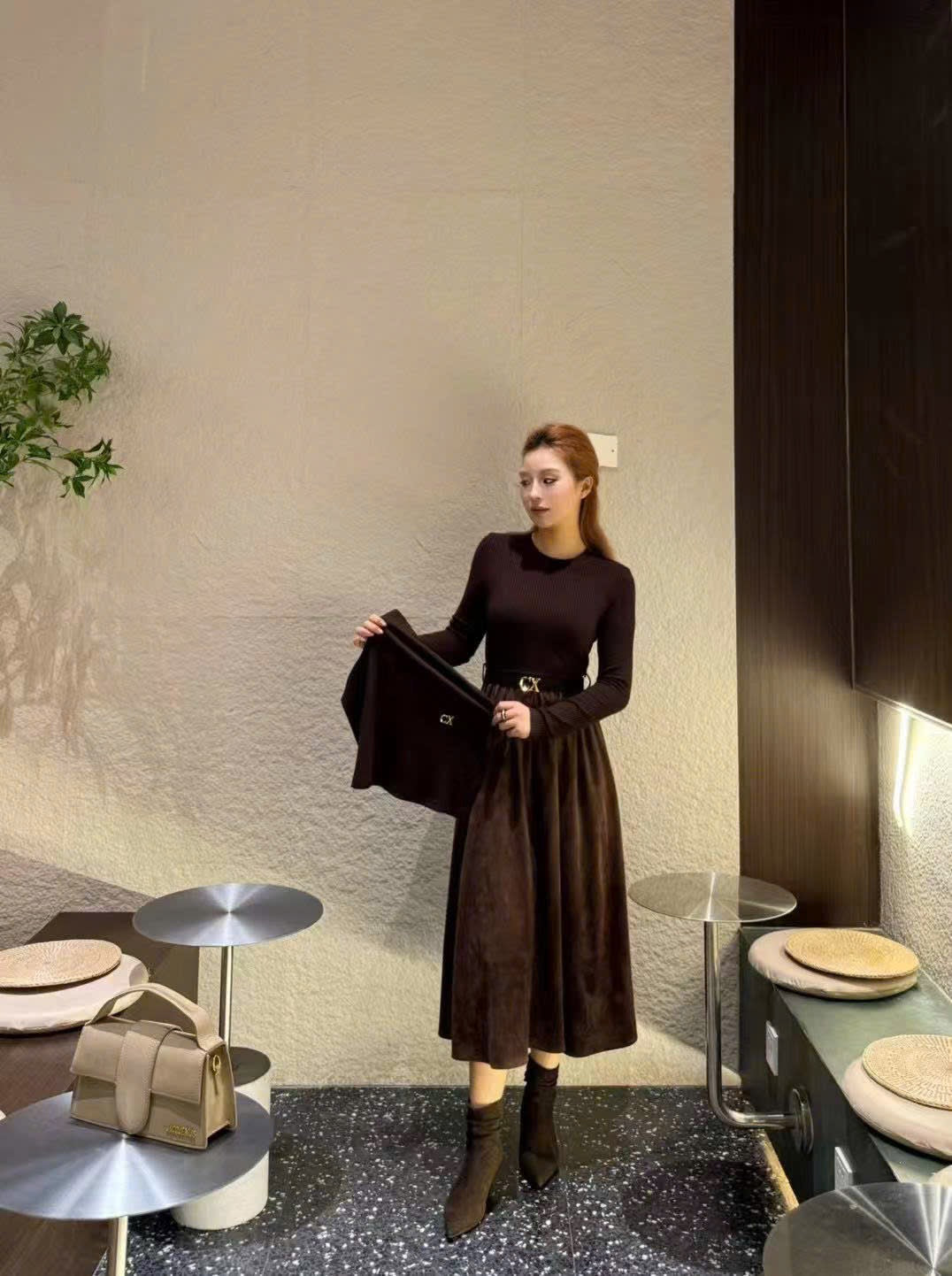 Featuring a soft, ribbed long-sleeve knit dress with a classic crew neck, paired with a luxurious suede-look A-line midi skirt.