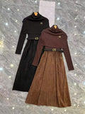• Set Includes: Long-sleeve knit top, A-line suede-look midi skirt, detachable ribbed turtleneck collar, and a belt.