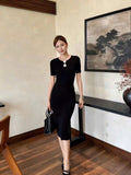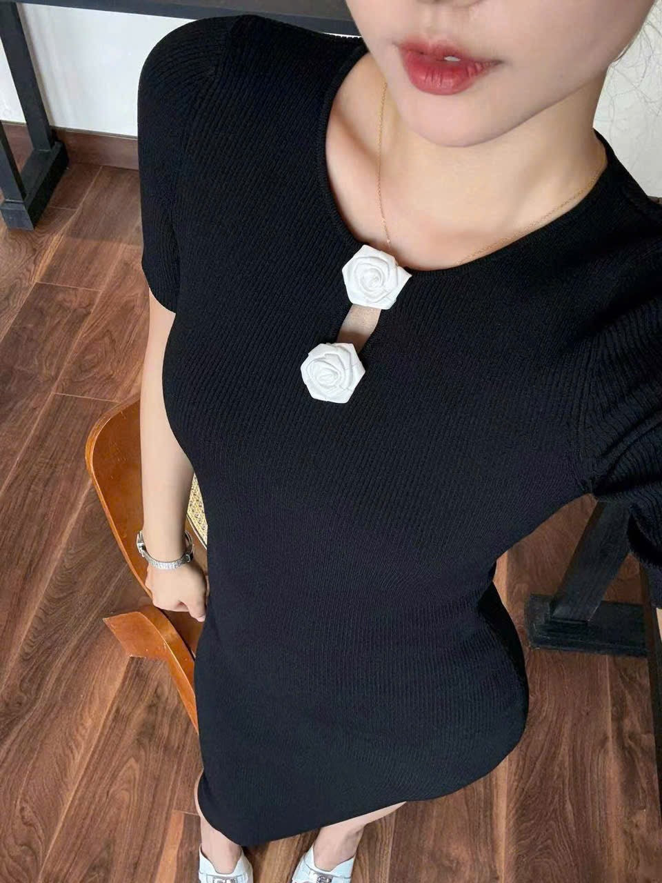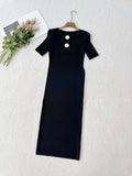 Meet the dress that does it all. Designed with a soft, ribbed knit that feels as good as it looks, this black midi dress offers a comfortable fit that moves with you. The beautiful white floral buttons at the neckline are the star of the show—they’re not just buttons, but delicate, sculptural details that make this dress truly special. Pair it with your favorite bag and shoes for an instantly polished look.